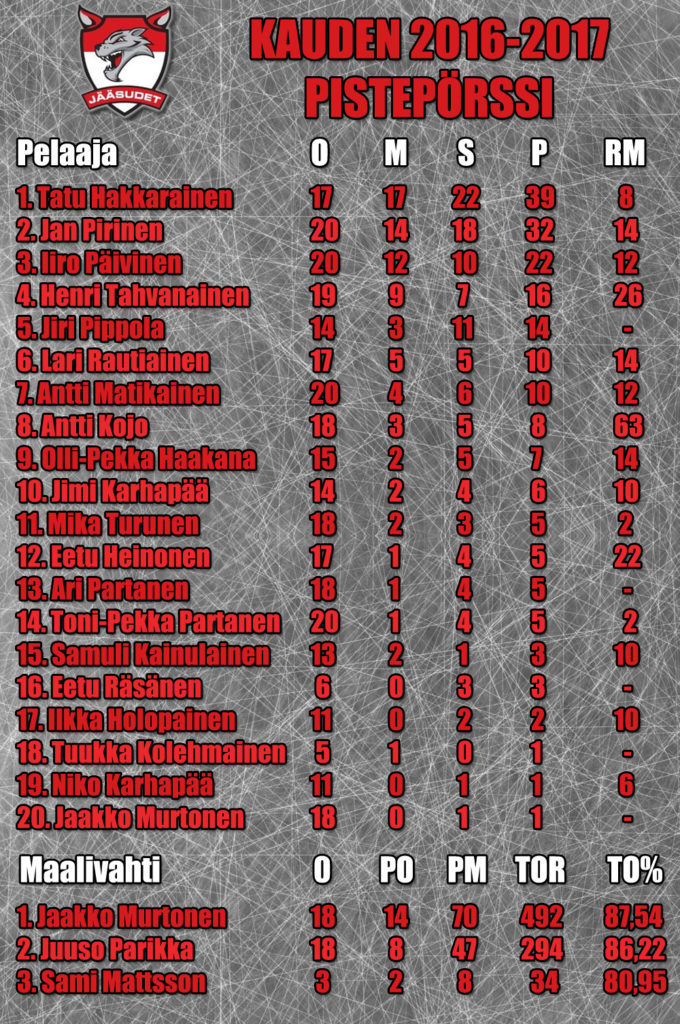Joukkueen sisäisen pistepörssin voitti viime vuoden tapaan kapteeni Tatu Hakkarainen. Kauden päätösiltamissa jaettiin myös seuraavia palkintoja: